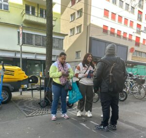 Una vez dados los talleres en la iglesia, tras la selección de ciertos tipos de materiales evangelísticos en distintos idiomas, se iniciaron unas horas de evangelización en el citado barrio de Altstadt Kleinbasel donde se encuentra la iglesia, contando con excelentes combinaciones de transporte público en el corazón de la ciudad de Basilea. Aunque es un barrio seguro, no dejan de verse personas sin techo y a pocos minutos hay una zona conocida por el ejercicio de la prostitución.